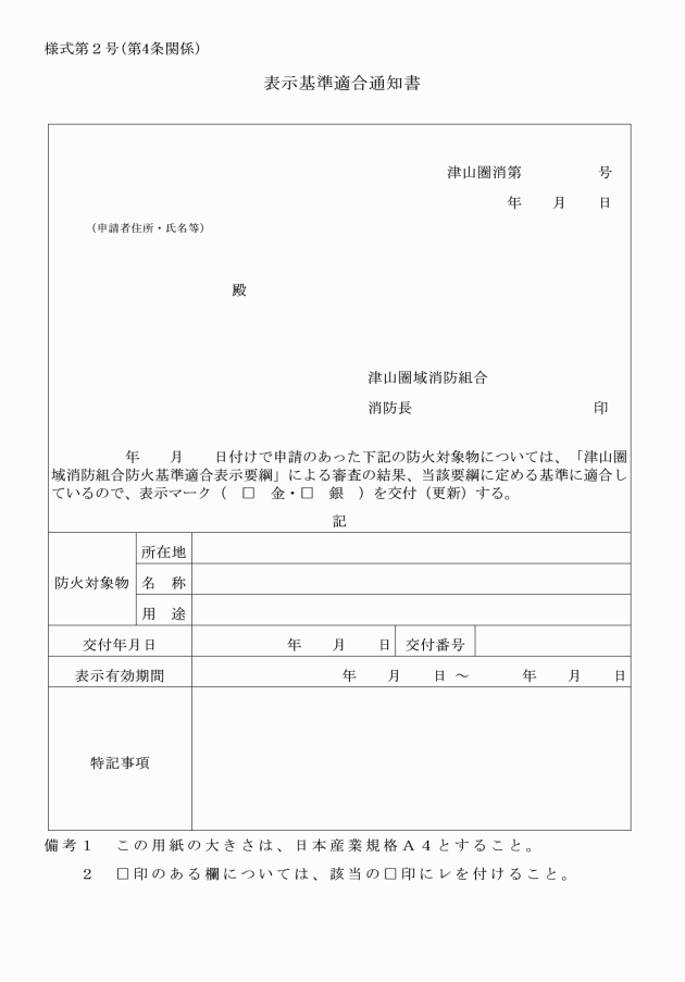 2 関係者からの申請により、消防長等が表示基準に適合していないと認めた場合、関係者に対して表示基準不適合通知書(様式第3号)により通知するものとする。