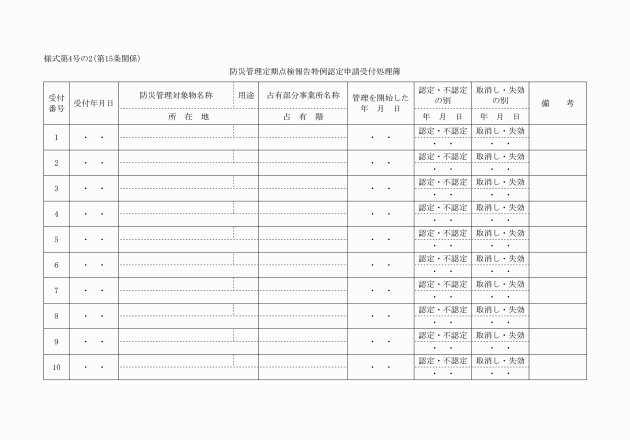 (2) 申請書を収受したときは受付欄に受付印を押印し、防火対象物定期点検報告特例認定申請受付処理簿(様式第4号。以下「申請受付処理簿」という。)に必要事項を記載する。