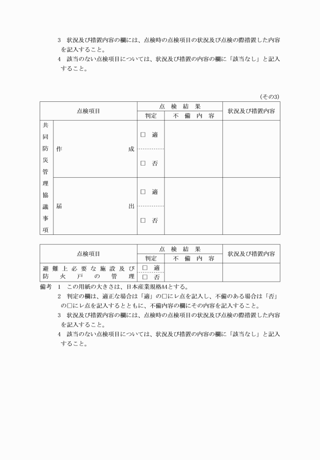 消防法第17条の3の3による点検及び報告の有無 | ・昭和50年4月1日付消防庁告示第3号に定める点検内容に応じて行う点検の期間ごとに点検を実施していること。 ・消防用設備等にあっては、消防法施行規則第31条の6第3項第1号に規定する期間ごと、特殊消防用設備等にあっては、同規則第31条の3の2第6号の設備等設置維持計画に定める点検の結果についての報告の期間ごとに報告されていること。 | |