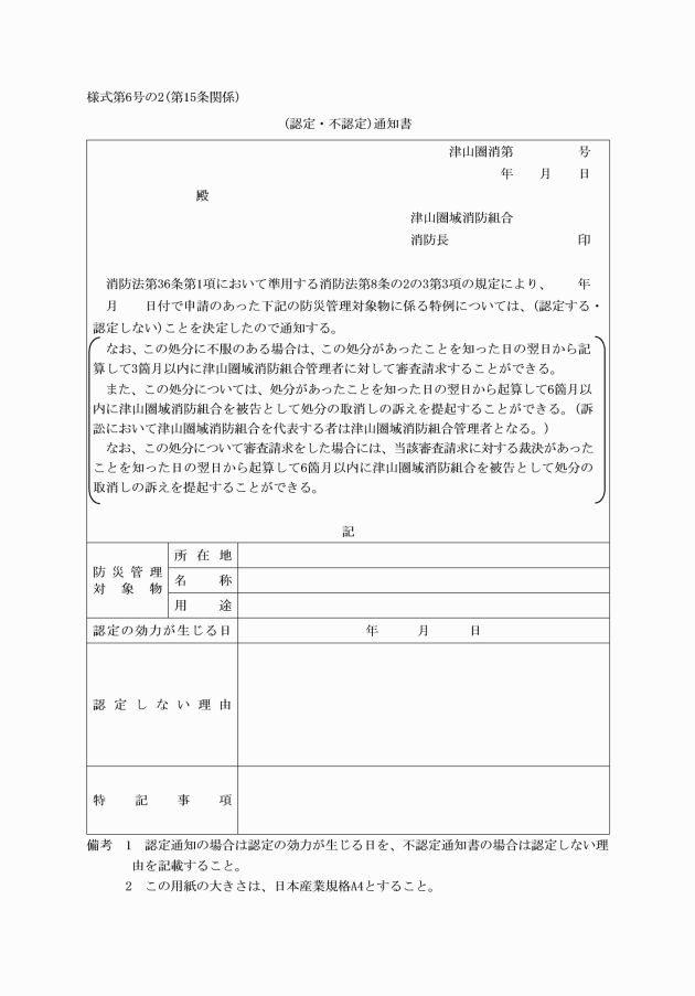 第9条 消防長は、法第8条の2の3第3項の規定に基づき認定しないことを決定したときは、不認定通知書(様式第6号)により申請者に通知するものとする。