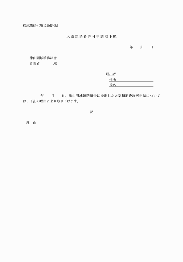 第13条 申請者が法第25条第1項の許可の申請を取り下げる場合は、火薬類消費許可申請取下願(様式第8号)を管理者に提出しなければならない。