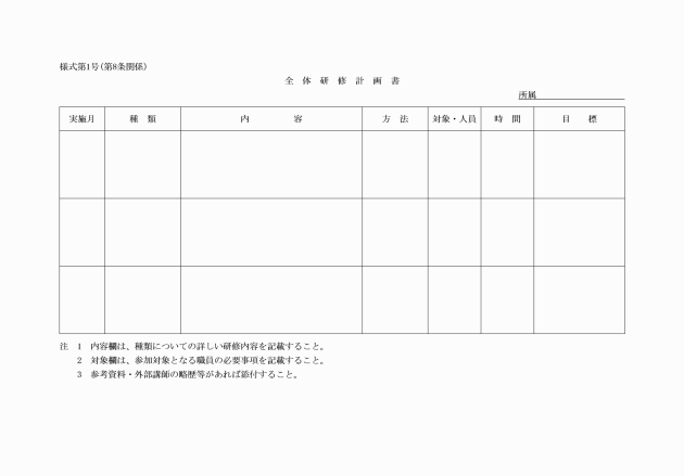 第8条 課署長等は、所管業務に係る当該年度の研修計画を立て、毎年4月末日までに、全体研修計画書(様式第1号)により消防長に提出しなければならない。