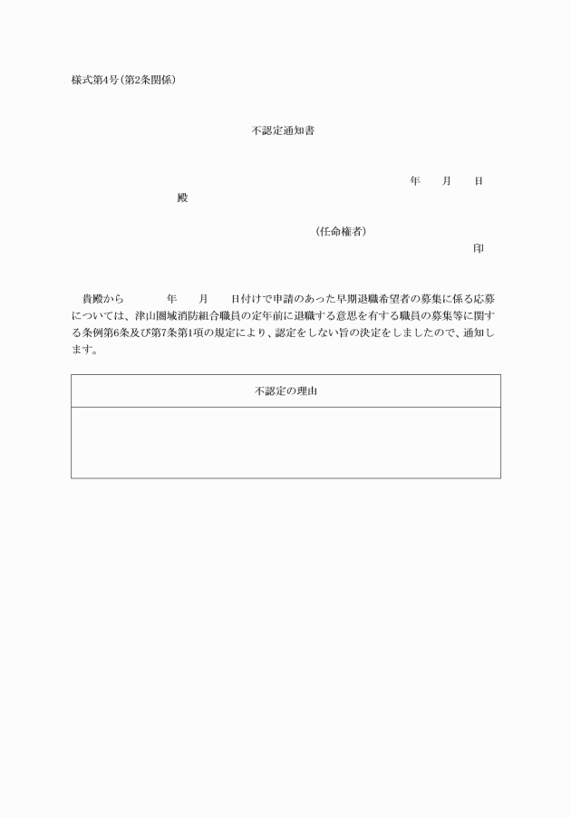 第1条 津山圏域消防組合職員の定年前に退職する意思を有する職員の募集等に関する条例(以下「条例」という。)第5条第1項の規定による応募(以下「応募」という。)は、様式第1号の申請書によるものとする。
