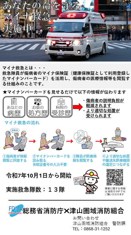 お知らせ マイナ救急の実証事業開始について 2025.9.29 マイナ救急とは、傷病者の健康保険証利用登録したマイナンバーカード(マイナ保険証)を活用し、救急車を利用する方の過去に受診した病院や処方されたお薬などの医療情報を救急隊が閲覧することで、救急活動の迅速化や円滑化を図る取り組みです。 津山圏域消防組合では、令和7年10月1日から実証事業を開始します。 詳細についてはこちらをご覧ください。 問い合わせ 津山圏域消防組合消防本部警防課 電話:0868-31-1252 [一覧へ戻る]